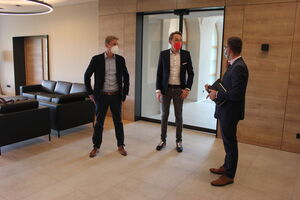 „Es ist beeindruckend zu sehen, was hier Neues entsteht“, sagte Marc Ruland, Generalsekretär der SPD Rheinland-Pfalz und Kreisvorsitzender der SPD Mayen-Koblenz, bei seinem Besuch in Maria Laach. Gemeinsam mit Christoph Schmitt, SPD-Bundestagskandidat, informierten sich die beiden über die Fortschritte an der Baustelle der neuen Klostergaststätte und im modernisierten Erdgeschoss des Seehotels. Philipp Lohse, Geschäftsführer der Benediktinerabtei Maria Laach, führte seine Gäste zum Rohbau des neuen Gastronomiegebäudes am Fuße der Basilika. Die Gruppe „Fries Architekten“ hatte nach einem Ideenwettbewerb den Zuschlag für die Ausführung erhalten. Nach ihrer Fertigstellung im kommenden Herbst werde man in der Klostergaststätte rund 300 Personen bewirten können. Sie bietet 150 Sitzplätze im Innenbereich sowie 150 auf der familienfreundlich gestalteten Terrasse mit Spielmöglichkeiten für Kinder.