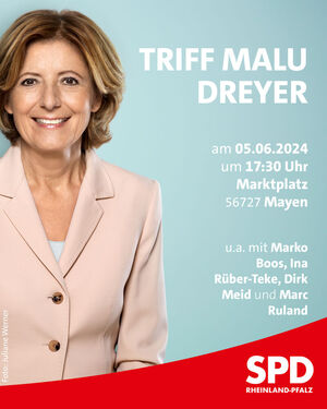 In diesem Jahr kann in Rheinland-Pfalz sowohl auf kommunaler wie auch auf europäischer Ebene gewählt werden. Diese Wahlen nehmen Malu Dreyer und die SPD Rheinland-Pfalz zum Anlass für eine Veranstaltungsreihe, bei der Bürgerinnen und Bürger mit Malu Dreyer und den verschiedenen lokalen SPD-Kandidierenden vor Ort über politische Anliegen, Sorgen und Ideen diskutieren können. Hiermit sind alle Interessierten herzlich zur Veranstaltung „Triff Malu Dreyer“ der SPD Rheinland-Pfalz mit Malu Dreyer, Ministerpräsidentin, am 05. Juni 2024 in Mayen eingeladen. Die Veranstaltung findet ab 17:30 Uhr auf dem Marktplatz in Mayen statt. Neben Malu Dreyer werden auf dem Podium Marko Boos, SPD-Landratskandidat und Spitzenkandidat für den Kreistag Mayen-Koblenz, und Ina Rüber-Teke, Co-Vorsitzende der SPD Mayen, Platz nehmen. Musikalisch umrahmt wird die Veranstaltung durch die Band MaJor.
